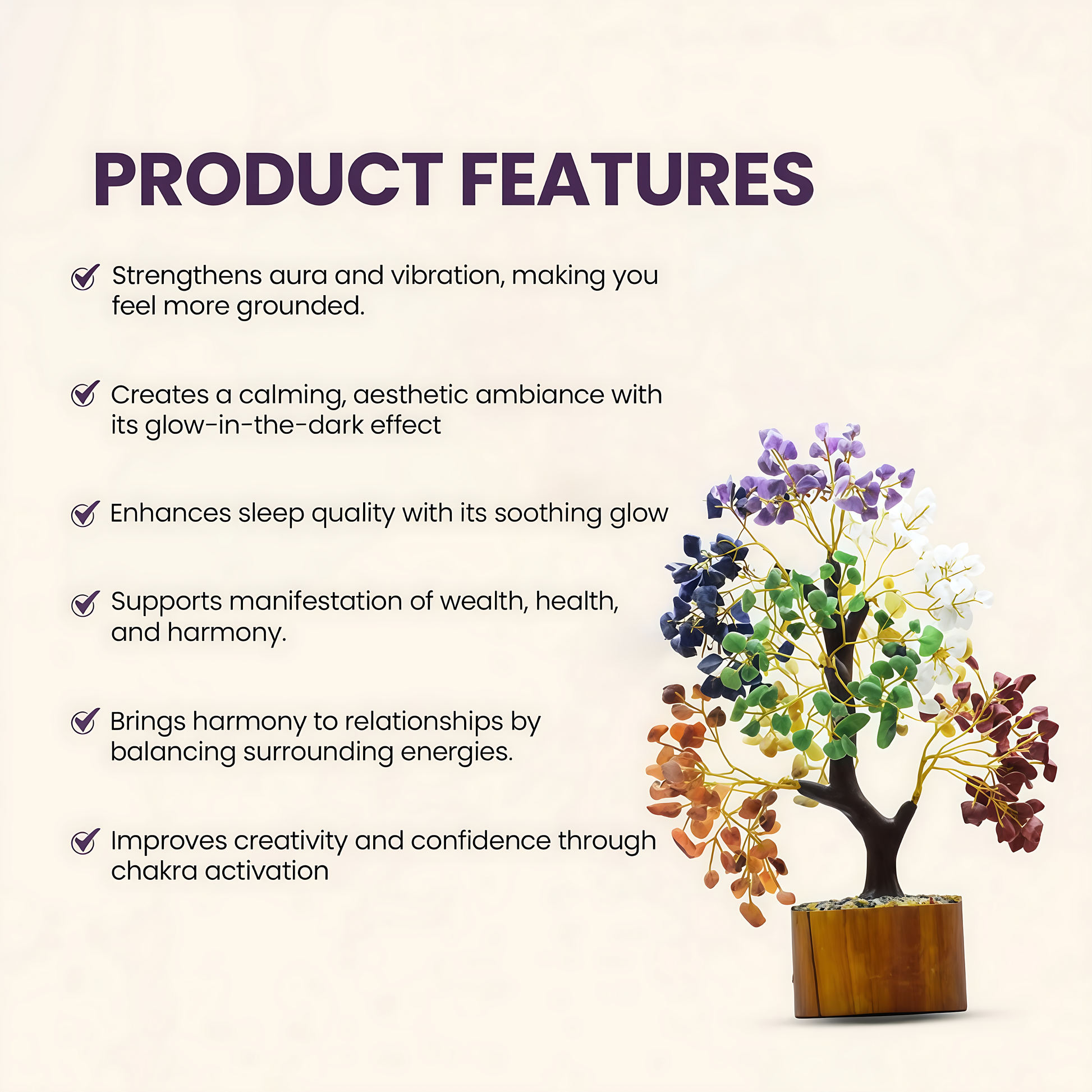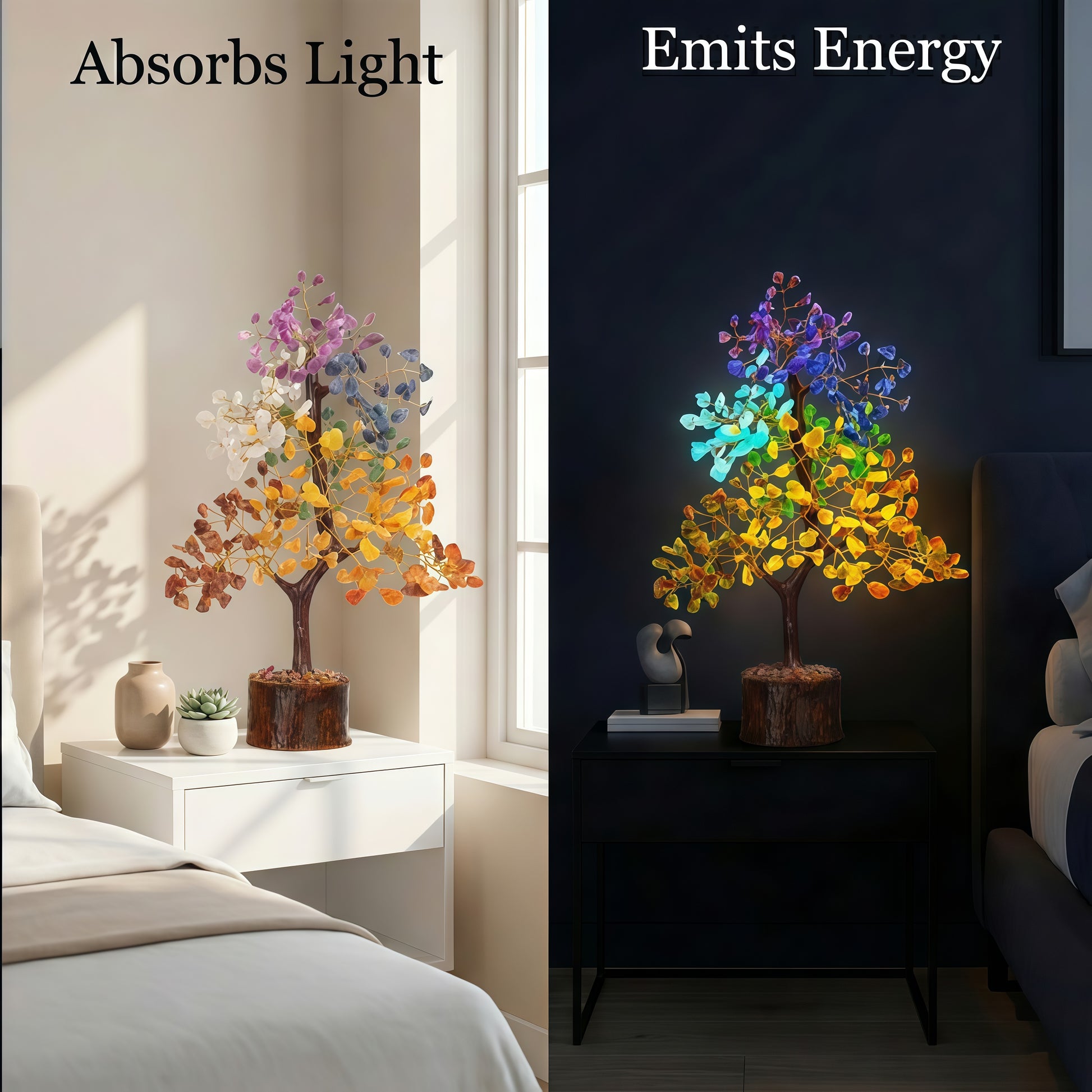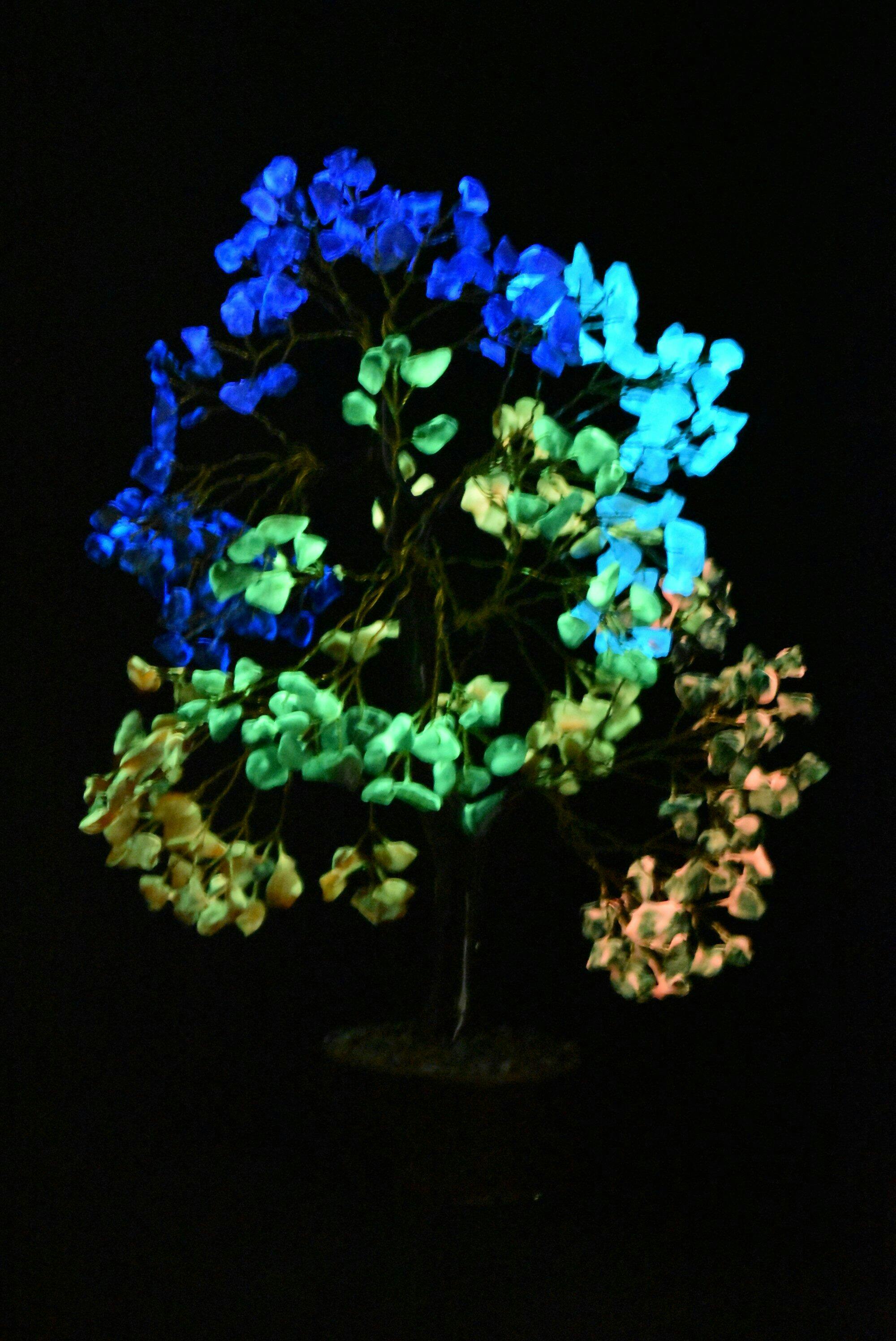 The Seven Chakra Glow In The Dark 300 Chips Tree is crafted to harmonize your energy, cleanse your aura, and activate all seven chakras for a life filled with peace, clarity, and abundance. Designed with premium glowing chips, this tree radiates calming light at night - making it a stunning décor piece and a powerful healing tool.